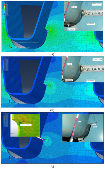 It can be seen that the crack begins to propagate along the direction perpendicular to the maximum principal stress, which conforms to the basic theory of crack propagation. The stress field at the crack tip changes with the crack propagation, and the crack-propagation direction changes slightly and tends to become horizontal gradually. The numerical simulation results and the crack location and morphology are consistent with the test results and the results of the real bridge, respectively [20,21], and the cracks in the diaphragm of a real bridge are basically consistent with those [22].
