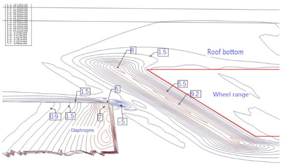 Contour of the principal stress of roof bottom at wheel trace (MPa).