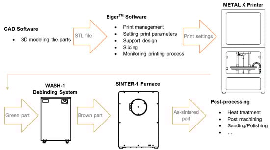 - Markforged. The Markforged Metal Additive Manufacturing Process. Available online: https://markforged.com/resources/learn/design-for-additive-manufacturing-metals/metal-additive-manufacturing-introduction/metal-additive-manufacturing-process (accessed on 5 December 2022).