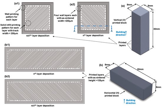 As-sintered 17-4 PH stainless steel (a) vertical (V) and (b) horizontal (H) blocks using the BPE Markforged Metal X system. (a1,a2,b1,b2) Schematic solid infill and wall printing pattern of nth and (n ± 1)th layers for V and H blocks.