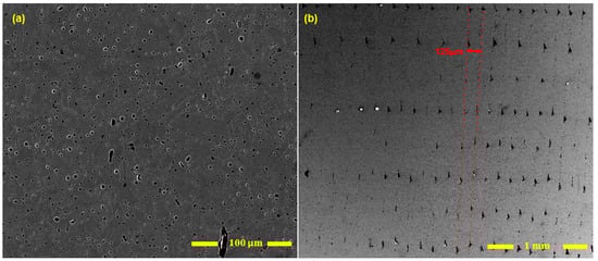 SEM images of the cross-section (Section A-A, Figure 3) of the polished and etched as-sintered part (V blocks, see Figure 4). (a) Voids in component and (b) voids at the layers’ interfaces (layers are in the shown direction, and the post-sintering layer thickness is 125 μm). Note—the building direction is along the red arrow shown in (b).