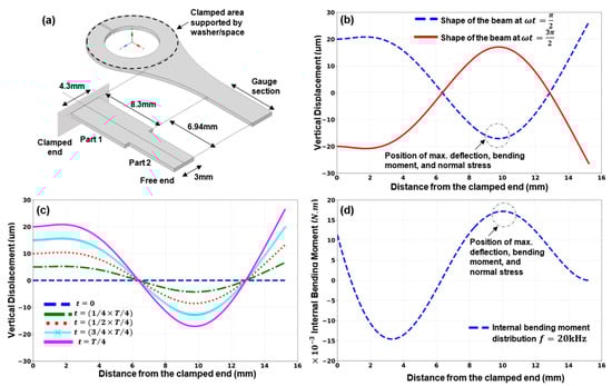 The ultrasonic bending fatigue test specimen deflects throughout its length when the supported end vibrates in a vertical direction. The gauge section experiences the maximum bending stress due to the test specimen’s deflection shape. Ghadimi et al. presented a general design approach for bending fatigue test specimens []. The specimen design needs to be assessed and validated for different testing materials. Consequently, the specimen design is discussed in brief in this paper. A cantilevered beam with an amplitude of displacement of at the fixed end is used to model and solve the vibration response of the test specimen. The dynamic Euler–Bernoulli equation for a homogeneous beam with a uniform cross-section area over the length of the beam is implemented to investigate the deflections and stress distribution of the given beam. The problem is solved using Python code in Jupyter Notebook. The properties for 17-4 PH stainless steel are used for the calculations.