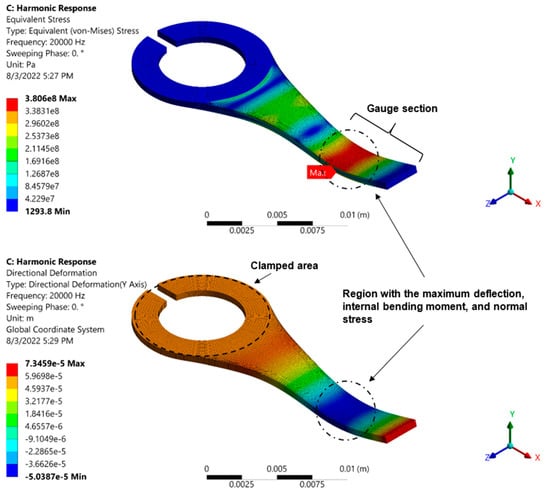 The design displays the intended and appropriate bending mode shape at the system testing frequency based on the findings from the finite element analysis. The displacement distribution throughout the specimen’s length as well as the equivalent von Mises stress distribution is shown in Figure 8. The maximum bending deflection and highest normal stress value occur at the mode shape’s peak. The outcomes of the theoretical analysis and the FEA simulation show good agreement.