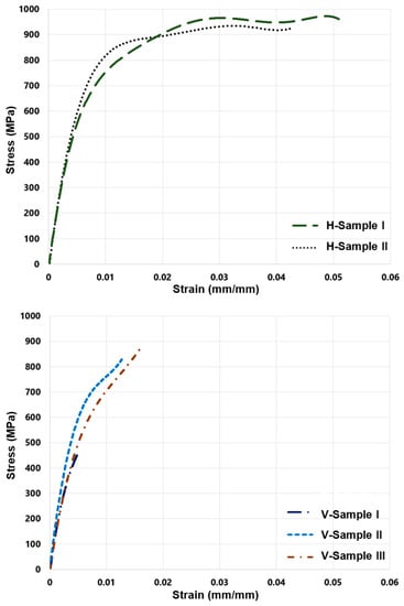 The V and H test specimens underwent a uniaxial mechanical tensile test. Multi-digital image correlation (Multi-DIC or 3D-DIC) was utilized to measure the change in the specimen’s length throughout the tensile test for strain calculation. Measurements were made of the applied load, the variation in the test piece’s length, and the engineering stress and strains were calculated accordingly. The results of the tensile tests for H specimens and V specimens are shown in Figure 9. Engineering strain () is in the horizontal axis of the stress–strain curve, while engineering stress () is on the vertical axis. The stress–strain curve has elastic and plastic regions. The ultimate tensile strength () of the material is the maximum stress when the necking starts. The test piece’s cross-section area rapidly shrinks during the necking process.