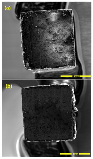 SEM image showing the fracture surfaces of the specimens. (a) Fracture surface of the vertically-printed specimen; (b) fracture surface of the horizontally-printed specimen.