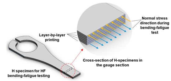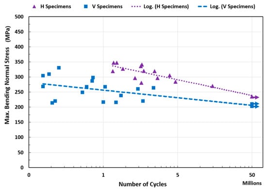 A constant amplitude strain-controlled, fully-reversed () bending fatigue test was carried out for V and H specially-designed test specimens in a high-frequency regime. Each specimen’s clamped end vibration amplitudes were measured, and the maximum applied normal bending stress at the gauge section was calculated. The test findings are presented in the stress–life graph in Figure 11.