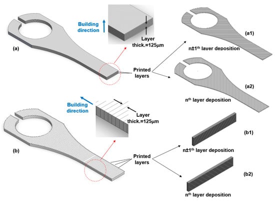 Schematic solid infill printing pattern of nth and (n ± 1)th layers for H (a,a1,a2) and V (b,b1,b2) ultrasonic bending fatigue test specimens.