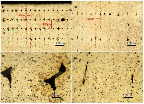 For a polished and etched surface of an as-sintered V block’s cross-section (Section A-A Figure 3), layer interface/track boundary voids at the (a,c) wall region and (b,d) the infill region and (d) pores/voids at the infill/main part region (the building direction is along the red arrow shown in (b)).