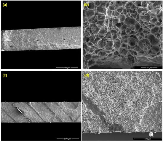 SEM image of the fracture surfaces after ultrasonic bending fatigue testing for (a,b) H and (c,d) V test specimens. (a,c,d) Layer interfacial/track boundary voids at the fracture surfaces; (b) fracture surface of as-sintered parts showing small-sized defects (pores and inclusions).
