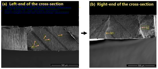 (a) SEM image of the fracture surface of a V fatigue specimen. The initiation of a crack from a pore close to the surface corner in region (a1), and (b) the crack propagation until it reaches the right end of the cross-section and tears off; the attached leftovers of the cross-section tear off in the two stages of (b1) and (b2).
