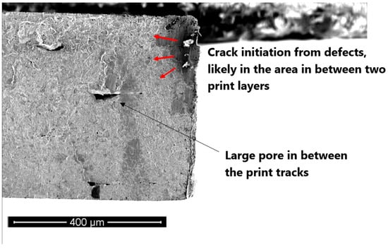 In the case of horizontal samples—in one case— a crack starts from a sintering defect and grows across the cross-section until total failure occurs (see Figure 17). The defect is likely to have been formed close to the print layer.