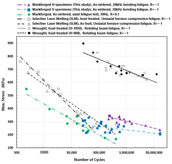 Comparing the stress–life data of a 17-4 PH SS test specimen made of wrought material [] (rotating-beam fatigue test) with those of test specimens fabricated using Markforged BPE (HF bending-fatigue test, as used in this study, and axial fatigue test []) and SLM (uniaxial tension–compression fatigue test) [].