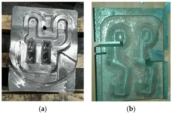 The investigated hot forging tools: (a) insert for forging “fork-type” forgings, (b) forging die designed for forging wound spreader components.