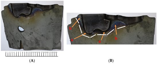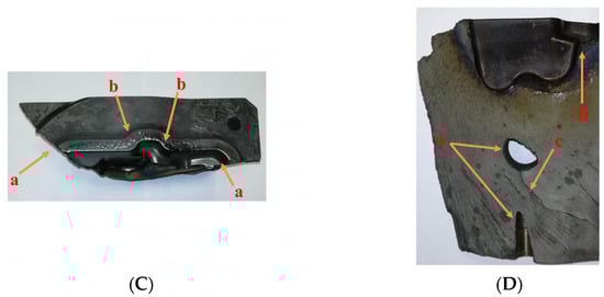 Cracked die insert for forging “fork-type” forgings: (A) view of the fracture surface, (B) the fracture with the deepest areas of the die insert cavity (marked “a”) and the extent of heat influence deep into the die insert (blue fracture surface, marked “b”); white line indicates the range of fracture surface oxidation during tool operation before its destruction, (C) with the locations of the intersection of the crack with the flash (marked “a”) and the wear marks on the flash bridge (marked “b”), (D) with the location of the holes for fixing the forging dies (marked “a”), the area of fatigue cracking (marked “b”), and the area of material “final fracture” (marked “c”).