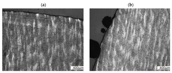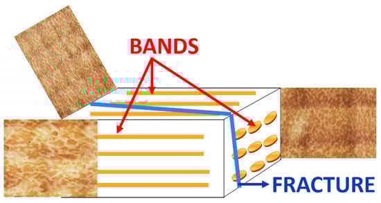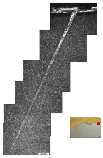 The study of crack development made it possible to present the change in the path of crack development in the widest possible range. The crack at the initial stage proceeded along the direction perpendicular to the die surface (perpendicular to the bands—Figure 15a) and parallel to its lateral plane (parallel to the bands—Figure 15b).