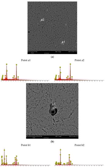 Images of the microstructure obtained with a scanning electron microscope indicate a die insert alloy matrix being a tempered martensite. Bright carbide precipitates and dark nonmetallic inclusions are evident. At the grain boundaries of the former austenite, dispersive particle precipitations are visible. In order to identify carbide precipitates and non-metallic inclusions, microanalysis was performed in their areas using a scanning electron microscope (Figure 6). The microanalysis performed in the area of the bright precipitates indicates molybdenum carbides (probably primary carbides). The gray precipitates are manganese sulfides and the dark precipitates are aluminum oxides.