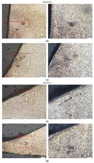 Microstructure of the investigated die insert in the near-surface layer with image magnification (area marked with red box): (a) areas selected for the analysis, (b) observation area 1 section a, (c) observation area 2 section a, (d) observation area 1 section b, (e) observation area 2 section b, (f) observation area 1 section c, (g) observation area 2 section c.