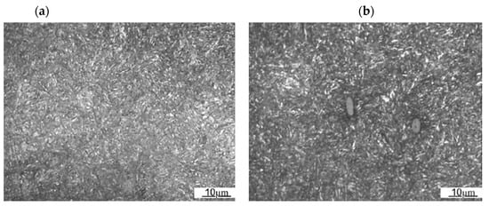 The microstructure of a forging die consists of tempered martensite. One can observe the local occurrence of tempered lower bainite in areas outside the bands (Figure 11a). This indicates the lower hardenability of the tested material in the center areas of the former dendrites. In the band areas (originally interdendritic areas), the martensite needles are finer. This indicates that there are some differences in the material’s properties inside and outside the band areas. Nonmetallic inclusions in the form of sulfides were also observed (Figure 11b), which correspond to the original interdendritic areas. Nonmetallic inclusions and, more precisely, the boundaries between them and the tool alloy matrix, can be a factor in the development of fracture and can even be sites of crack nucleation. However, the contribution of sulfides should be considered acceptable especially with regard to the fracture mechanics of hard tool steels.