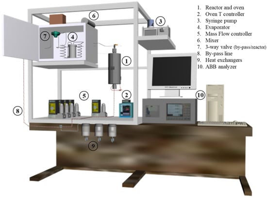 A fixed-bed stainless-steel reactor (250 mm in length, 9 mm in internal diameter) was used for the gas-phase reaction, fed with a pre-heated inlet stream, using a syringe pump, an evaporator, and a mixer to homogenize the reaction flow. The fixed-bed consisted of 0.5 mL of the thermally treated and reduced catalyst with a 300–400 μm grain size. A heat exchanger was used to condense the outlet liquid phase (water and non-reacted formic acid), and the gas phase (H2, CO, CO2, and CH4) was continuously monitored by an ABB AO2020 analyzer. The gas-phase set-up is schematized in Figure 1.
