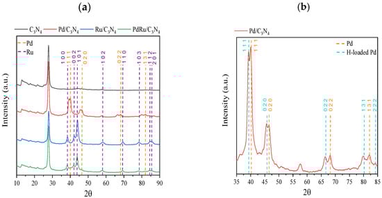 (a) XRD patterns of C3N4, Pd/C3N4, Ru/C3N4, and PdRu/C3N4; (b) Zoom of XRD pattern of Pd/C3N4 catalyst.