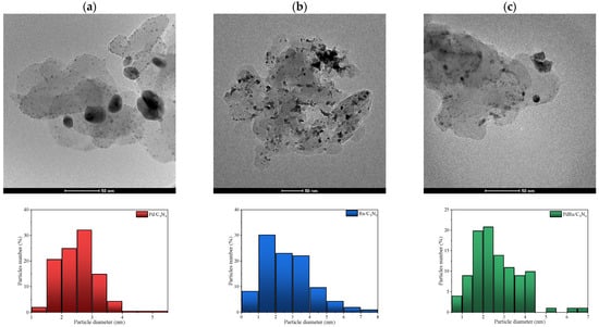 HR-TEM images obtained for (a) Pd/C3N4, (b) Ru/C3N4, and (c) PdRu/C3N4, and the corresponding size-distribution histograms.