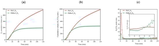First, the catalytic activity was studied in liquid-phase conditions. In all cases, only H2 and CO2 were detected as products, whereas no traces of CO, CH4, or other hydrocarbons were detected. In other words, the selectivity was completely shifted towards the desired dehydrogenation reaction. The cumulative volume of produced hydrogen, the total produced gas (H2 + CO2), and the H2/CO2 molar ratio are shown in Figure 4.