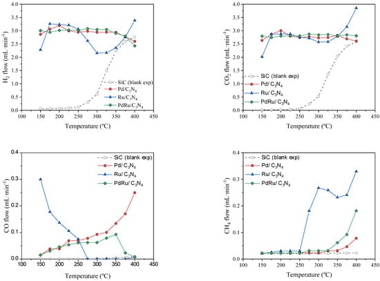 Gas-phase FAD activity in terms of H2, CO2, CO, and CH4 volumetric flows vs. temperature is shown in Figure 6. As observed from the blank experiment with SiC, formic acid thermal decomposition starts at 275 °C and reaches a complete conversion at temperatures above 350 °C.