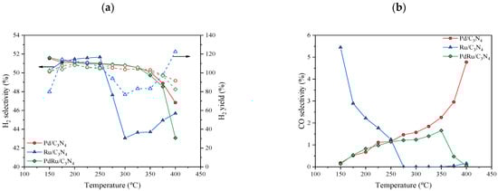 H2 and CO selectivity and hydrogen yields (empty symbols) are summarized in Figure 7. For none of the catalysts, did the CO selectivity surpass 6%, and for the Pd and Pd-Ru catalysts, a CO-free gas stream was obtained, but in different temperature ranges. For the latter, the selectivity towards formic acid dehydrogenation, and as a consequence H2 production, was around 100%. In terms of H2 yields, it can be observed that values close to 100% were obtained at most temperatures.