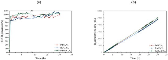 Evaluating the results of the hydrogen production for the three catalysts, one can conclude that Pd is the only metal that acts as an active phase. The monometallic Pd catalyst reached values of 140 mL of H2 in 120 min, while the monometallic Ru did not show activity in the reaction. In the same way, the presence of Ru in the bimetallic catalyst lowered the activity of the catalyst to the production of about 60 mL of H2 under the same conditions. However, comparing the Pd/C3N4 and PdRu/C3N4 catalytic performances based on TON and TOF, it is observed that the obtained values are rather similar (Table 2), considering only Pd as an active phase. Regarding the H2/CO2 molar ratio, values from the monometallic Ru catalysts were not calculated since they did not show catalytic activity. In the other two catalysts, after 20 min of reaction, values were close to 1, as expected due to the reaction stoichiometry (Equation (1)). During the first 20 min of the reaction, the high ratio values can be explained since the reaction was just starting, and CO2 and H2 are measured by different devices. We must not forget that the support can also play an important role through its interaction with the metal [48]. One can speculate that the nitrogen species located on the C3N4 surface are able to play a dual role: they stabilize the Pd particles and provide adsorption sites, as well as reducing the electron density on the Pd surface, thus allowing for easier adsorption of reactives [48,49,50].