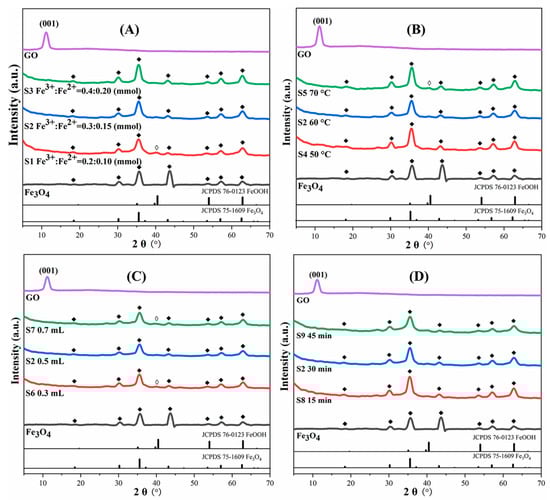 | Sample | GO (mg) | FeCl3·6H2O (mmol) | FeSO4·7H2O (mmol) | NH3·H2O (mL) | Temperature (°C) | Reaction Time (min) |