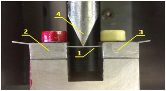 Three-point bending test apparatus. Position 1 indicates the sample being tested; Positions 2 and 3 indicate the specially made incisions in the props; Position 4 indicates the indenter.