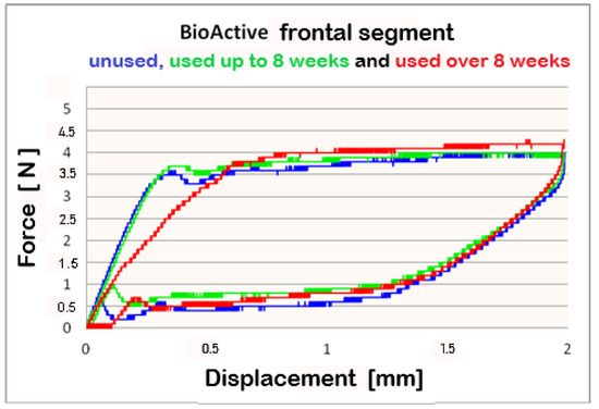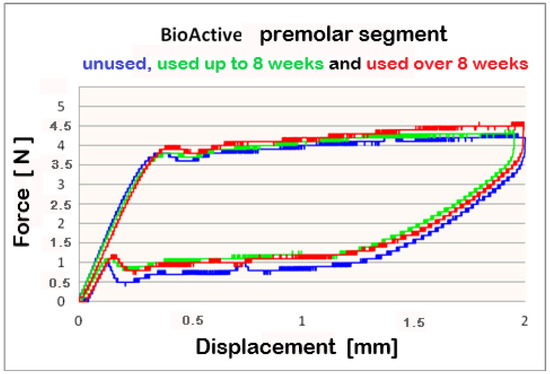 We found that after a clinical use of up to 8 weeks and over 8 weeks, the shape memory effect and superelasticity are preserved, as well as the tendency for differential force release along the length of the archwires, which is kept during usage. In the three segments of used Bio-Active® orthodontic archwires in group II, in the process of deactivation, the following tendency is again observed, with a decrease in the deformation (controlled deviation); the released forces also decrease. Released forces at 2 mm, 1.5 mm and 0.5 mm deformation have statistically significant differences, being the highest at 2 mm deflection/deformation and the lowest at 0.5 mm deflection.: frontal 4 N (400 cN), premolar 4.3 N (430 cN), molar 5 N (500 cN) at 2 mm deformation; frontal 0.5 N (50 cN), premolar 1 N (100 cN), molar 1.2 N (120 cN) at 0.5 mm deformation. In group III of Bio-Active®, the values of forces are as follows: frontal segment 4.2 N (420 cN), premolar 4.4 N (440 cN) and molar 5.2 N (520 cN) at 2 mm and 0.7 N (70 cN) frontal; premolar 1.2 N (120 cN) and molar 1.4 N (140 cN).