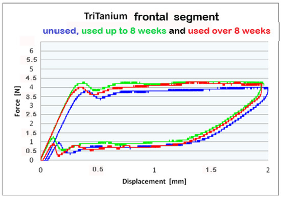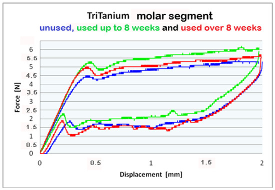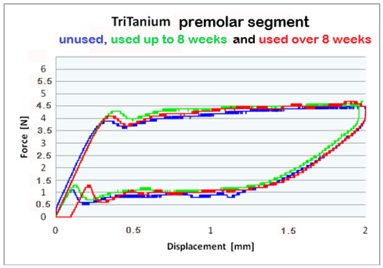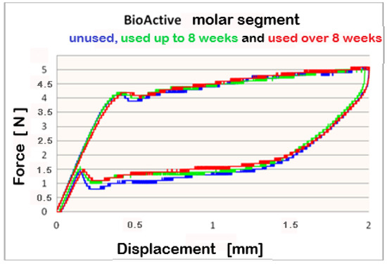The statistical analysis conducted on TriTanium® and Bio-Active® for the three segments (frontal, premolar and molar), for the periods of clinical use (G0, G1, and G2) and archwires’ deformation at 0.5 mm, 1.0 mm, 1.5 mm, and 2.0 mm, did not show statistically significant differences. Comparing the segments (frontal, premolar, and molar) of TriTanium® versus Bio-active® shows that TriTanium® releases slightly higher forces. Nevertheless, after clinical use for periods of up to and over 8 weeks, differential force release along the length of TriTanium® and Bio-Active® archwires is kept as forces are progressively increasing from front to back.