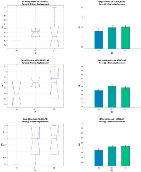 All tests on the mechanical properties of the archwire were performed at a temperature of 36 °C, which is close to the temperature of the oral cavity. The temperature was regulated using a thermostat, keeping it constant. Measurements of the mechanical properties of each type of archwire were performed also for the three sections formed after segmentation. The unloading forces in the UNLOAD phase were measured at 0.5, 1.0, 1.5, and 2.0 mm, respectively.