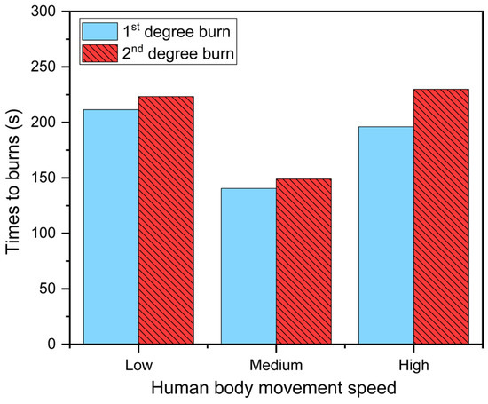 - Human body movement speed along the same movement path has a significant effect on skin burn. The current model reduces the time to 2nd degree burn by 33.3–35.2% under medium movement speed.
