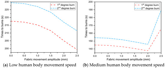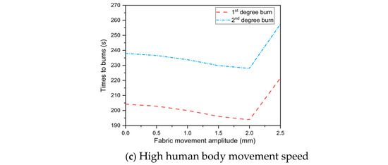 - At low movement speeds, the time to skin burns was negatively correlated with fabric movement amplitude. With an increase in fabric movement amplitude, the time to 2nd degree burn was reduced by 7.9%. When the fabric movement amplitude was 2.5 mm at medium and high movement speeds, the negative effect of fabric movement amplitude on skin burn was eliminated. Reduced time to 2nd degree burn was by 12.9–29.8% when compared to 2 mm fabric movement amplitude.