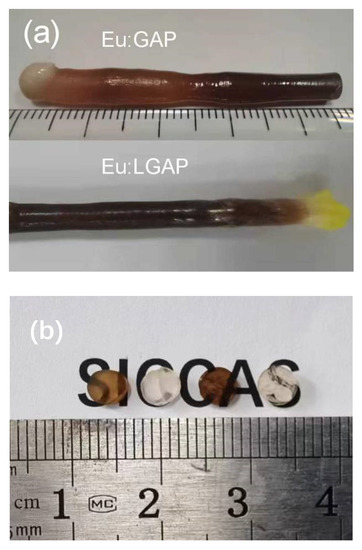 Figure 1a shows a photograph of the as-grown Eu:GAP and Eu:GLAP crystals rods. All of the crystals are almost crack-free and are of a dark brown color. Figure 1b shows the crystal circle pieces cut vertically along the direction of crystal growth. After annealing in flowing Ar (+5% H2), the Eu:GLAP crystal pieces appeared transparent, while the Eu:GAP crystals were an opaque white.