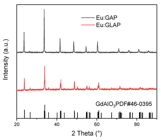 Figure 2 shows the PXRD patterns of the as-grown Eu:GAP and Eu:GLAP crystals. All diffraction peaks of the crystals matched well with the standard GAP (PDF#46-0395), indicating a formation of the desired perovskite GAP phase. All crystals show a similar crystal structure and belong to the cubic crystal pm3m space group. In addition, the absence of secondary phases indicates that Eu3+ completely entered into the GAP lattice through a solid solution [21]. In addition, the diffraction peak did not present a dramatic shift, which might indicate that the lattice constants of Eu:GAP and Eu:GLAP crystals are similar.