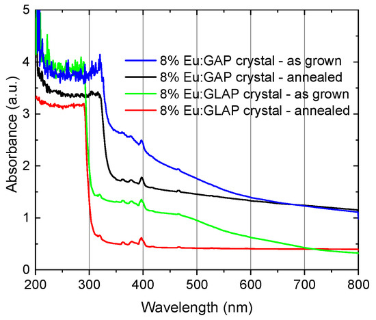 Absorbance spectra of the as-grown and annealed Eu:GAP and Eu:GLAP crystals (after double-side polishing to 1.0 mm thickness).