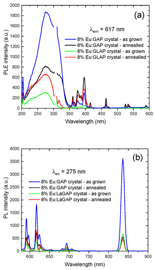 Photoluminescence spectra of the as-grown Eu:GAP and Eu:GLAP crystals; (a) PLE λem = 617 nm; (b) PL λex = 275 nm.