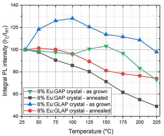 Temperature dependence of PL integral intensity of Eu:GAP and Eu:GLAP crystals with or without post Ar (+5% H2) annealing process, λex = 275 nm.