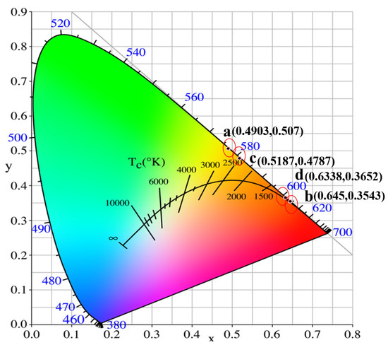 CIE chromaticity coordinates for the (a) as-grown Eu:GAP crystal; (b) annealed Eu:GAP crystal; (c) as-grown Eu:GLAP crystal; (d) annealed Eu:GLAP crystal.