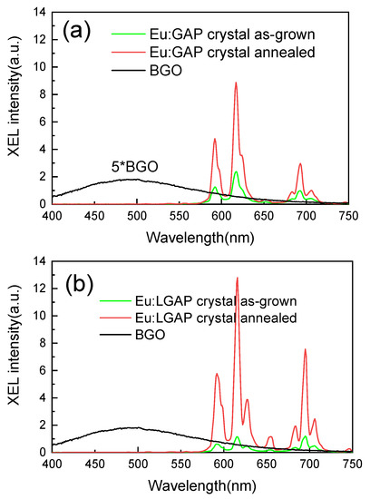 The XEL spectra of the Eu:GAP and Eu:GLAP crystals with or without the 1000 °C for 4 h in Ar + 5% H2 annealing process are shown in Figure 9, with a Bi4Ge3O12 (BGO) single crystal as a reference sample. The typical 5D0 → 7FJ transition of Eu3+ under X-ray excitation was almost the same as that of the PL (λex = 275 nm) spectra. The significantly increased strength of the annealed crystals is expected to make them a potential candidate for applications in X-ray detection and imaging.