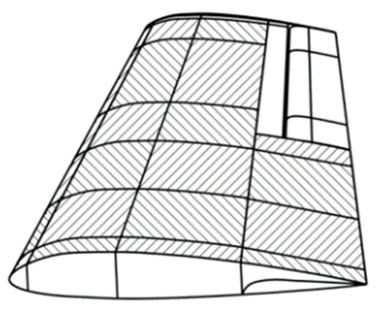 Only aerodynamic environmental forces (lifting force and drag force) have an influence on the wing skin (Figure 1). The lifting force ensures the carrying of the fuselage with passengers or cargo in the air, and the air resistance is overcome by the thrust of the engines. Being distributed over the span of the wing, the lifting force can be transferred to the fuselage to balance the gravitational forces by means of a structural element working on bending. Such elements include beams, shells, and plates. The principle of their operation is nearly the same and similar to a beam or a thin-walled rod [9].