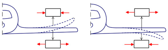 All the structures operate in different conditions and, depending on this, they are affected by different natures and magnitudes of the load. Naturally, the product must always remain functional. Depending on the maneuver that is performed, the wing of the aircraft bends up or down (Figure 4), then the upper (or lower) skin is stretched in one case and compressed in the other. These scenarios are most typical for an aircraft to encounter during a stable flight (Figure 4, left) when the lifting force acts vertically upwards, and when the aircraft is stationed in a hangar (Figure 4, right) with the gravity forces acting on the wing vertically downwards.