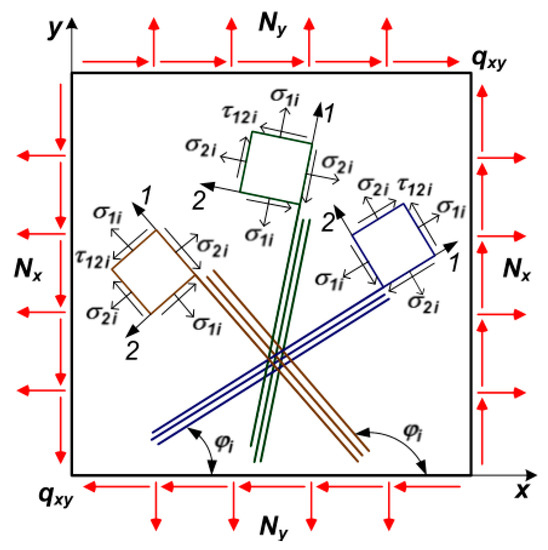 Further, in Figure 5, a schematic diagram of the composite panel structure is shown for a better understanding. x and y are the axes of lamina itself and 1i and 2i are the axes of each layer i. Nx, Ny, and qxy are the linear and shear loads acting in the plane of lamina, σ1i, σ2i, and τ12i are the stresses acting on each layer, respectively, along, across, and tangential. φ is the orientation angle of the specific layer.