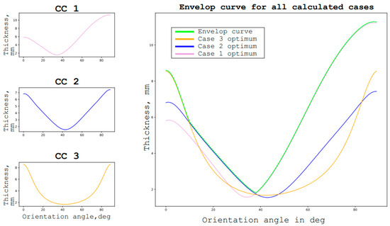 First, the determination of the optimal reinforcement angles of the package for each design case is done, provided that the entire package is executed with a ± φ structure. After that, the construction of the envelope curve is made by finding the optimal reinforcement angle that satisfies all the calculated cases. As can be seen in the graph, the optimal orientation of the layers is ±38° degrees.