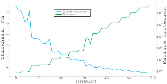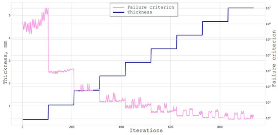 Surprisingly, the resulting thickness in this case turned out to be even smaller than in the full search [28,29]. This happened because these are discrete iterative algorithms, and the result of each next step is better than the previous one by some specific amount [30]. The value of the failure criterion (which should be less than 1, but tends to it because the smaller it is, the greater the margin of safety), and in the case of the full search, the algorithm found the best solution. Therefore, the next iteration changed the failure criterion to 0.8263, which rather indicates the imperfection of the first algorithm. The rejection criterion for the latest Tabu search algorithm from this initial value was 0.9562, what explains why this thickness was smaller [31,32].