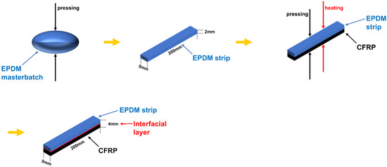 A total of 3.5 g EPDM compounds were compressed into the mold for 24 h at 10 MPa (the height of the strip was 2 mm) to gain the EPDM strip. Following that, the EPDM strip was removed from the mold and the epoxy resin prepreg was laid flat in it. Before placing the EPDM onto epoxy prepreg, 7 cm lengths of isolation paper were set on both sides of the epoxy resin prepreg which could make the 90° peel strength test easier to carry. Eventually, the EPDM strip was deposited on the epoxy resin prepreg, and the mold was sealed firmly. The curing processes for CFRP/EPDM composites are demonstrated Table 2 with various temperatures (160 °C, 170 °C, 180 °C) and times (20 min, 30 min, 40 min, 1 h). The graphical abstract for manufacturing CFRP/EPDM composite is illustrated in Figure 1. The dimensions of the specimen were 200 mm × 5 mm × 4 mm.