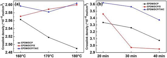 The crosslink density of EPDM rubbers (a) 1 h at various temperatures (160 °C, 170 °C, 180 °C); (b) 160 °C for various times (20 min, 30 min, 40 min).